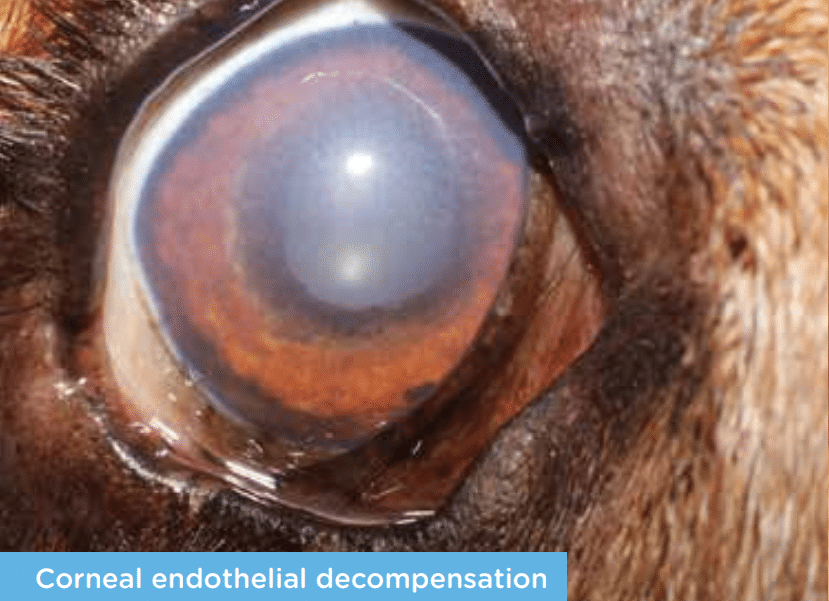 Corneal endothelial degeneration is a condition usually encountered in ageing dogs. The cornea functions as a clear window to allow light to enter the eye. It is a very delicate and complex structure, which maintains its transparency by microscopic fluid pumps located within cells on the inside of the cornea, which remove fluid from the cornea. These cells degenerate with progressive age and similar to brain cells, don’t regenerate. As these cells reach a critical number, the pumping mechanism becomes insufficient to maintain transparency and the cornea becomes cloudy, due to accumulation of fluid within the cornea.