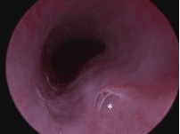 Image of the urethra of female dog with an ectopic ureter using the cystoscope. The ectopic ureter can be seen opening into the urethra (*).