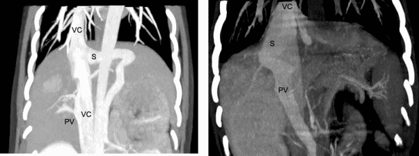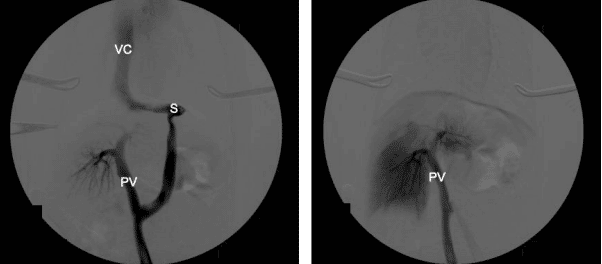 (right). S = shunt, PV = portal vein, VC = vena cava