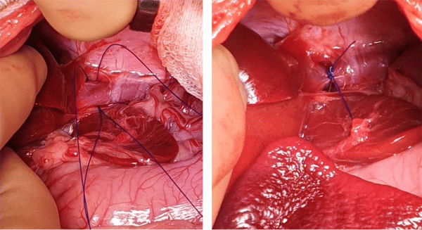 The aim of surgery is to close the shunt and restore normal portal blood flow to the liver and hence normal liver function. In an ideal world, all shunts would be completely closed at the time of surgery. However, complete shunt closure is not possible in approximately 50% of dogs with extrahepatic CPSS as the liver and portal venous system are hypoplastic and cannot tolerate normal portal flow leading to portal hypertension. For this reason, gradual attenuation devices have been developed to allow complete shunt closure without the risk of portal hypertension. These include ameroid constrictors and thin film bands. These are placed around the shunt and provide gradual closure over a period of weeks. However, one disadvantage of these devices is that once they have been placed there is no control over the rate or completeness of closure. This can lead to persistent shunting if the device fails to close the shunt completely or if the shunt closes too rapidly, resulting in MAS. Persistent shunting is reported in 24- 37.5% of dogs. At Paragon we tailor the surgical treatment to the individual dog and their owners. We believe that the overall goal of shunt surgery should be to completely close the abnormal vessel either gradually or acutely, in order to abolish all shunting and give the dog the best possible outcome. We perform intraoperative mesenteric portovenography in all dogs during surgery to help identify the shunt and assess the degree of portal development. Dogs are assessed during the surgery to see if they can cope with full closure of the shunt (based on subjective and objective assessment of portal pressures and the degree of portal development on IOMP). Complete ligation is performed in dogs that can tolerate it and those that can’t have placement of an ameroid constrictor or thin film band. A length of suture is left around the shunt in order to facilitate any future surgery if persistent shunting is subsequently identified.