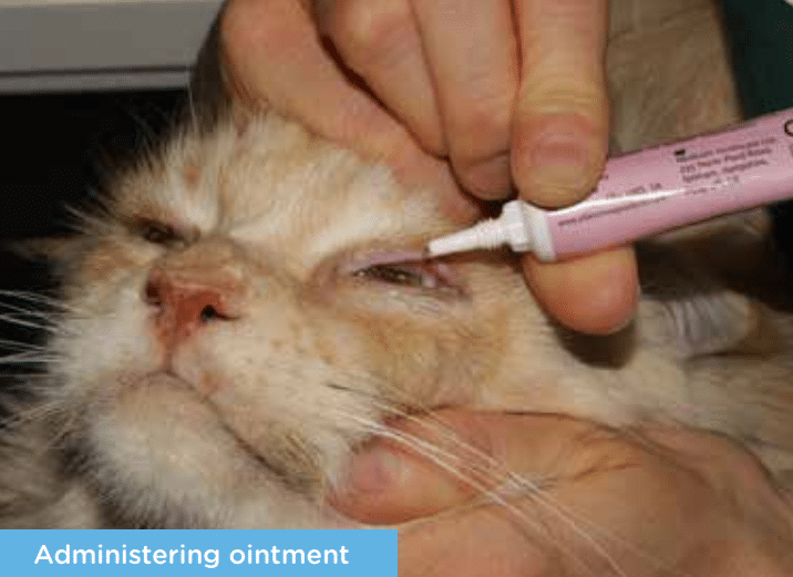 Just like applying eye-drops gently raise your pets head with your left hand. Hold the ointment tube in your right hand and gently squeeze the tube to apply ointment just inside the eyelid. Avoid touching the eye with the tip of the tube or scratching along the surface of the eye with it by maintaining contact with your pet via the palm of your right hand on its head.