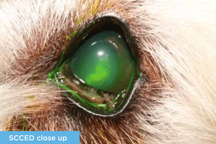 An indolent ulcer is a superficial non-infected erosion of the surface of the eye (cornea), which may occur spontaneously. The characteristic features are loose edges of the ulcer and poor response to standard medical treatment in a dog in a dog which is usually 6-8 years or older.