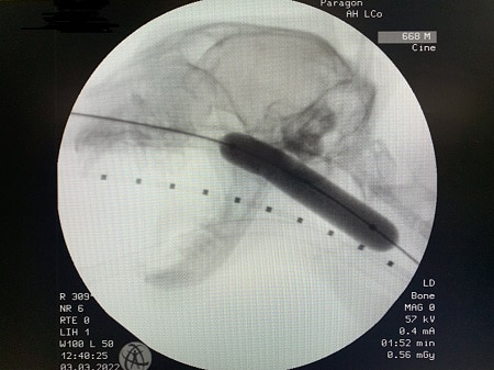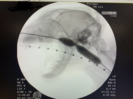 Internal medicine specialist and head of service Andrea Holmes; internal medicine specialist Lizzy Conway and internal medicine intern Simona Borgonovi performed a balloon dilation under fluoroscopy and endoscopy guidance to cure the issue.